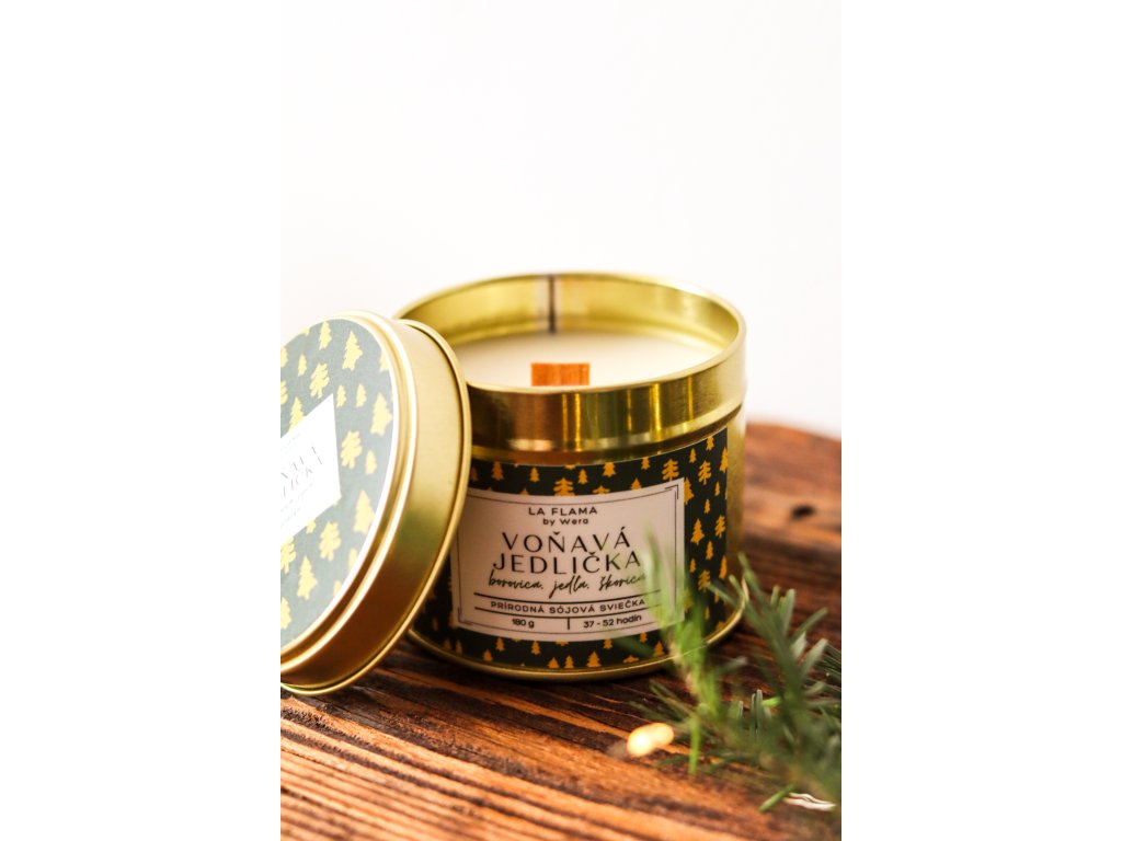 🎄 Vianočná jedlička – Sviečka v luxusnej zlatej plechovke s praskajúcim knôtom 🎄